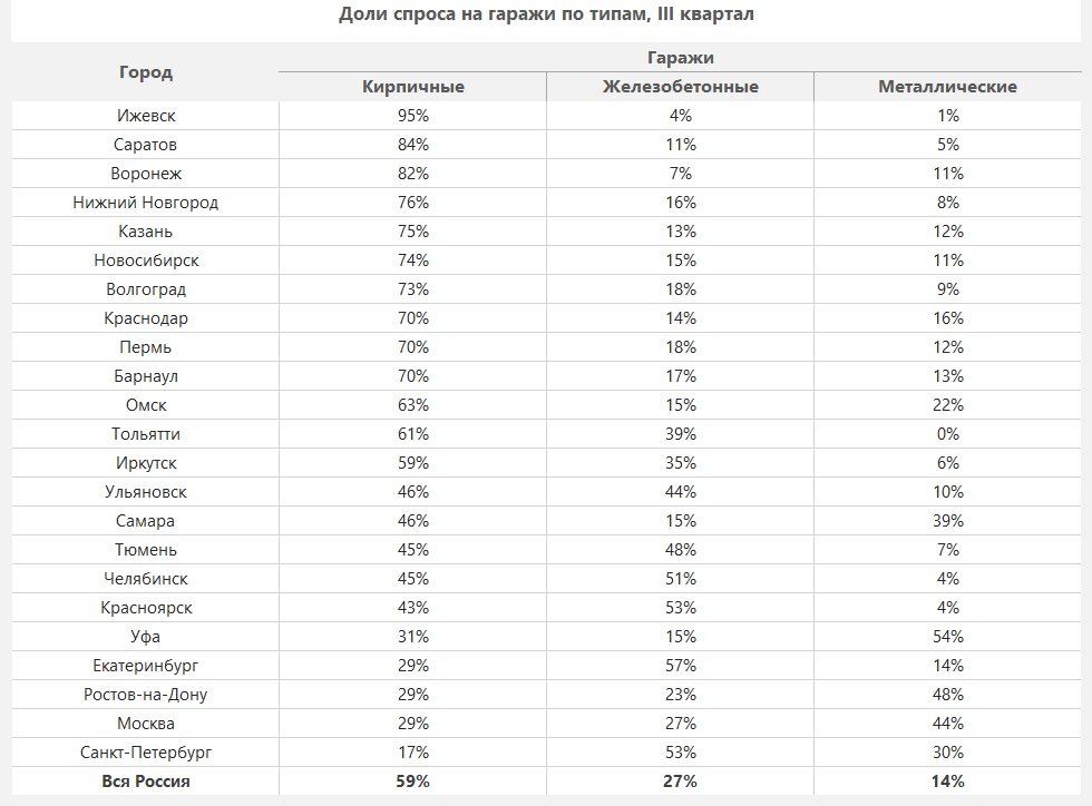 Распределение «внутригаражного» спроса по типам материала постройки также ожидаемо оказалось в пользу более «монолитных» конструкций из кирпича и железобетона: кирпичные гаражи популярнее прочих в 15 регионах из 23, а еще в 5 предпочтение отдают железобетонным. Самые дешевые металлические гаражи удерживают высочайшую популярность лишь в Уфе и Ростове-на-Дону. Велика их доля и в Самаре, где они,